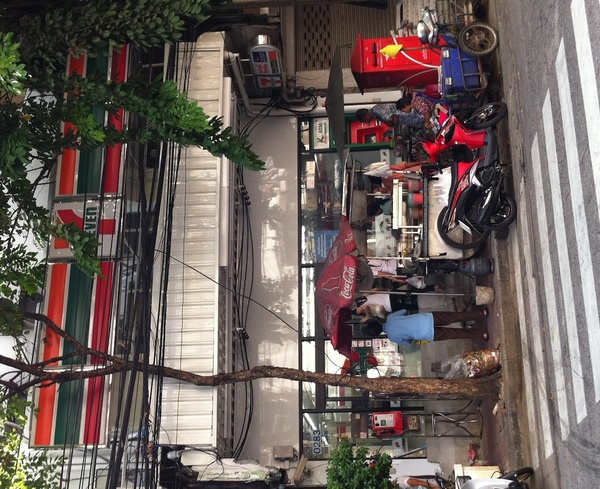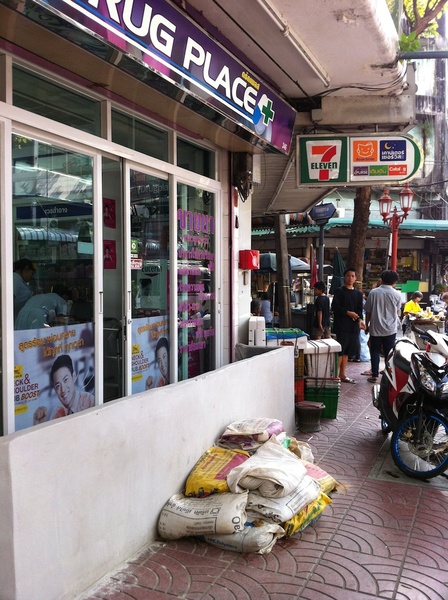 右の写真は、「セブンイレブン」の店頭を写した写真です。いたって普通の景色ですが、「ひとつだけ」違和感を受けるかもしれないものが映っています。それは、店の前を覆う「コンクリート壁」です。水が店の中に入らないようにと、店を囲うように1mほどの壁が作られていています。セブンイレブンの店の中に入る人たちは、ヒョイヒョイと土嚢で作られた”階段モドキ”を上り、小高いコンクリ壁をまたいでいくのです。こんな「防水城壁」が店の前・家の前に作られていることも多いので、まるで「街中にある色んな道」の周りに「堤防」が作られたような状態になっています。