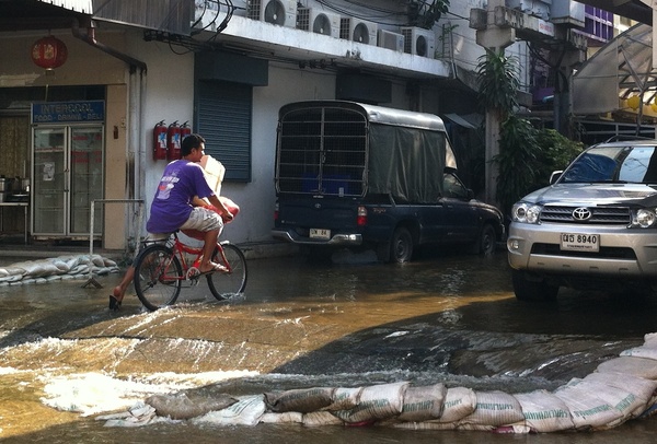 洪水被害がなかなかおさまらないタイのチャオプラヤ川は、通常は、バンコク近辺では時速2km程度で流れていますが、今は川の流れは時速6km程度と(結構驚くほど)速くなっています。