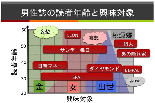 「金・女・出世・ここではないどこか」という成分比率が「年齢」を追ってどのように変わっていくかということを、この「男性誌の年齢・成分比率解説図」から読み解いてみると、実にリアルな現実と男性の心の中の妄想が浮かび上がってくるのではないか、と思います。