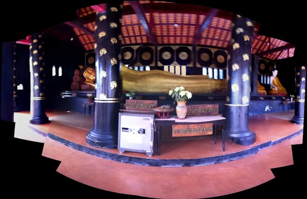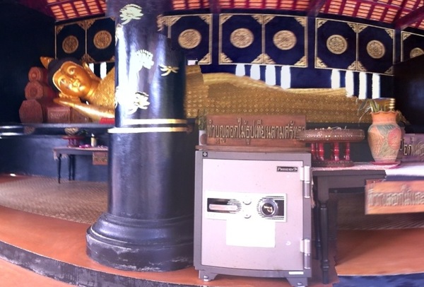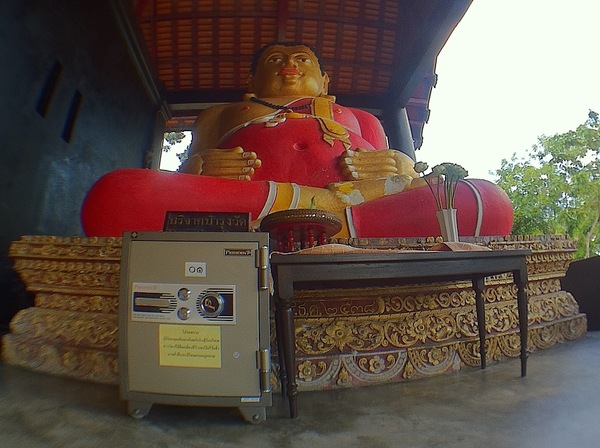 神さま仏さまに祈り・感謝のために、お金を入れる箱を「お賽銭(さいせん)箱」と呼びます。私がこれまで見た中で一番「実務的で・飾らない・実にフランクな」お賽銭箱が、下の写真です。タイはチェンマイで眺めた、「肥えてパンパンに膨れた腹を抱える仏さま」の前には(どう見ても金庫にしか見えない)お賽銭箱が鎮座している…という実に素敵でロハスな景色です。