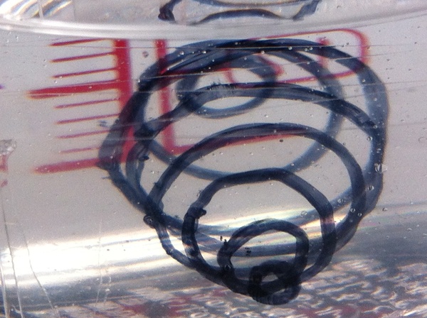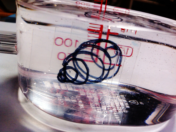 透明シートを(屈折率がほぼ同じ)オイルの中に入れれば、透明シートは「存在しない」のも同じです。そうすれば、見えるのは「(見えない透明シート上に印刷した)インク」だけ、ということになります。…というわけで、今日は、「透明シート印刷+オイル浸け」で「立体プリント」の「当たり実験(とりあえず、やってみて、どんな感じになりそうか感触を掴むための実験)」をしてみました。(うう?誰でしょう?最終目的は〜巨乳ビジョンの撮影データを印刷するための〜巨乳体感ビジュアリゼーション・プリンタを作るのが目的だろう!と言っているのは…)