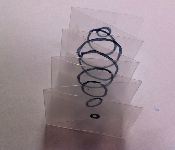…そんなこんな気持ちに駆られ、「立体フルカラープリンタ」を、昔ながらの素朴・単純なやり方で作ってみることにしました。「昔ながらの素朴・単純なやり方」というのは、透明シートにパターンを印刷し・折り畳んで(離散的な)立体印刷(もどき)を作るというものです。