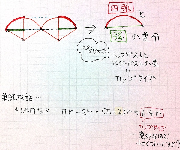 もちろん、半球状バストなんて、そんなマルマルとした超立体的バストなんか非現実的ですが、そんな非現実的な立体バストの場合、「円弧と弦の長さの差分=トップバストとアンダーバストの差=カップサイズ」は「(パイ−2)×胸の半径」になります。パイ=円周率は3.14...ですから、「胸の半径に約1.14を掛けたもの」が「トップバストとアンダーバストの差=カップサイズ」に相当するわけです。