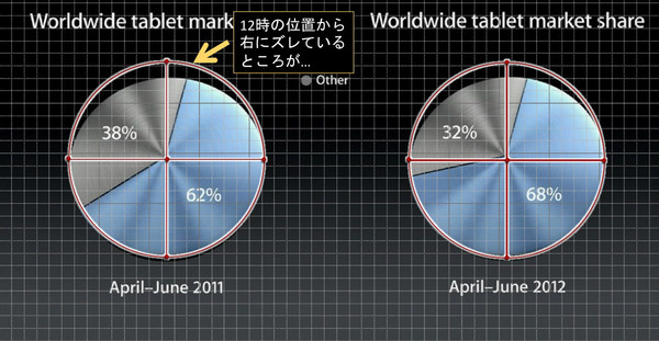 Appleが9月12日に示した「タブレット市場におけるiPadのシェア推移」のグラフ(参考:CHART OF THE DAY: Tim Cook Used These Charts To Make Fun Of Amazon And Google's Tablet Sales)が何だか少し奇妙です(右図)。何がどのように奇妙かというと、円グラフに描かれている「データ系列」が12時の位置からではない、ということが奇妙なのです。