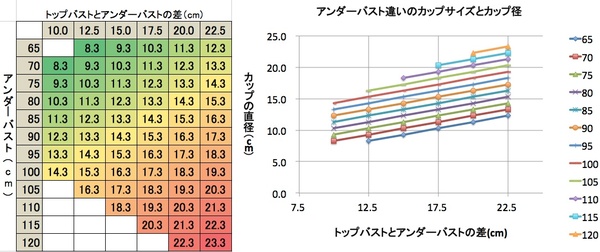 下の図は、アンダーバスト長違いにおける、カップサイズ(アンダーバスト長とトップバスト長の差 cm)とカップ径 cmの関係を示した結果です。なんと、このブラジャー型紙データは、アンダーバスト長とトップバスト長の差 cmとカップ径 cmは見事に1次の比例関係になっています。…つまり、カップサイズの3乗でおっぱいの体積・重さが増大してしまう、ということになります。