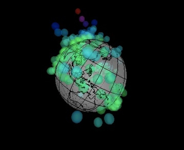 たとえば、下に貼り付けた動画(と右に貼り付けた画像)は、世界240 国の経済データを使って「”1人あたり”GDP(国内総生産)をプロットしてみた地球儀」です。1人あたりの名目GDP(USドル)が高いほど、高い場所に印を付けてみたもので、日本は240国中では17番目です。上位の国は、 ルクセンブルク・カタール・ノルウェー・スイス・オーストラリア…という具合です。「”1人あたり”GDP(国内総生産)の地球儀」を眺めてみると、ヨーロッパ一体が何やらとても華やかに見えてきます。