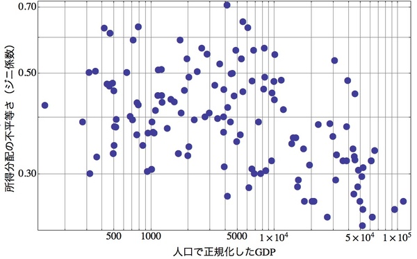 右のグラフは横軸に「人口(国民数)で正規化したGDP」をとり、縦軸には「所得分配の不平等さを示すジニ係数」をプロットしてみたものです。貧しい国でも(横軸の左側)、豊かな国でも(横軸の右側)、所得分配具合には「等しくなさ」が存在することがわかります。