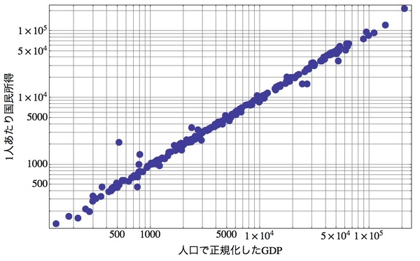 たとえば、右上のグラフは、横軸に「人口(国民数)で正規化したGDP」をとり、縦軸に「国民1人あたりの国民所得(national income)」をプロットしてみたものです。このグラフが直線的、つまり「国の中で生産されたもの価値≒国民所得」となるのは当たり前で、GDPと国民所得というものは、つまりそういう「定義」の数字なのです。