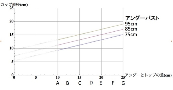 実は、カップサイズ(つまりアンダーバストとトップバストの差)が変化しても、ブラジャーのカップ径(つまりオッパイの径)の大きさはさほど変わりません。たとえば、アンダー75cmの場合、カップサイズがAカップからGカップに、つまりアンダーバストとトップバストの差が10cmから25cmに2.5倍になったとしても、カップ径は10cmから15cmへと1.5倍変化するだけに過ぎません。(参考:おっぱい解析向けライブラリを書いてみる!? 第2回)
