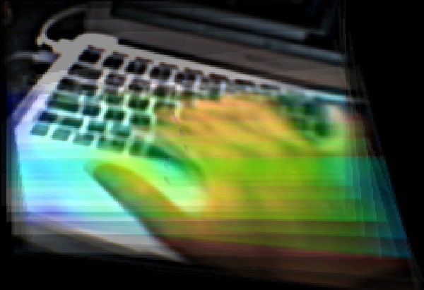 そして、サーモカメラ(遠赤外線)ではなくて、近赤外線カメラをHMDに取り付けて「近赤外線(視覚)動物」になってみると、世界はこんな感じに見えてきます。目の前にあるハッピーハッキングなキーボードは、なんとビックリ!超ハッカー仕様な無刻印モデルに変身します!(もちろん、可視光ではちゃんと文字は見えます…)