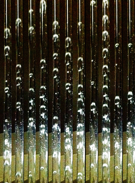 そこで、いきなり2次元面のディスプレイを作る前に、まずは単純な「1本だけ」のユニットを作り・勘所を掴んでみることにしました。…というわけで、作ってみたのを動かしてみたところが、下に貼り付けた動画です。透明な柱の中を浮かび上がっていく泡に向けて光を当ててみると、意外なほどに綺麗です。