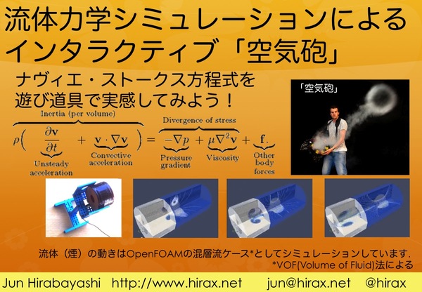 明日・明後日(23日・24日)、「作った色々なもの」を展示するお祭りMaker Faire Tokyo 2014が東京ビッグサイトで 開催されます。そこで、「第3ホール19島の7(理科教育研究フォーラム)」という場所で、流体シミュレーションを活用した「インタラクティブ空気砲」を展示しています(参考:「ビックサイトの第3ホール 19島の7」でお待ちしております)。