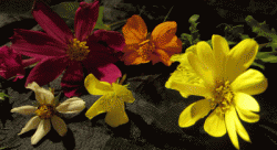 紫外線カメラで眺めるなら、せっかくなので「昆虫が普段眺めていそうなもの」として、川沿いに咲いていた花を摘んで撮影してみたのが下の写真です。左の写真がが可視光のカラー画像、右が紫外線撮影したものです。紫外線で眺めてみると、同じような色に見えても、花びらと花の中心部の明るさが全く異なっていたりして面白くなります。またあるいは、可視光では暗く沈んだ赤色に見えていた花が紫外線の世界では明るく輝いていたり、生き生きとした明るい橙色の花が紫外線では全く見えない暗黒のような花だったり…と意外で面白く感じます。