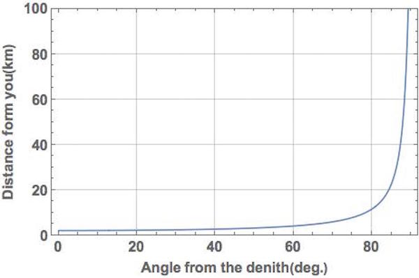 実際のところ、雲の高さや距離は、どちらか片方がわかってしまえば、もう片方は自動的に求まる性質のものだ。前述の「雲までの距離」を計算するための式は、雲の高さr、雲の天頂からの角度α、地球の半径Rという3つのパラメータを用いたものだから、天頂角度α、地球半径Rがわかっている限りは、雲の高さか雲間での距離のどちらか片方がわかってしまえば、残りひとつの未知数は単純に計算することができる。たとえば、雲の高さを地上から2000mに固定すると、雲が見える方向(天頂からの角度)に応じた雲までの距離は、次のようなグラフとして描くことができる。
