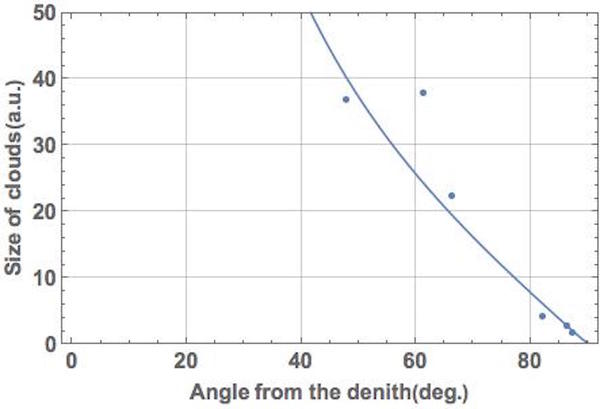 ためしに、バンコクで眺めた雲の位置と大きさの関係をデジカメ撮影画像から算出して、散布図にしたのが下左図だ。天頂から離れた「遠い」雲ほど小さいという単純な関係だ。この雲の位置と大きさを観察した関係から、雲の高さrと比例係数sを「手動で」フィッティングしてみると、たとえば、雲の(底面)高さが500mの場合で、下右図のような対応となる。この数日が真実と近いのか・遠いのかはわからないけれど、こんな風に、原理的には、大きさが同じ雲の位置や大きさがどのように見えるかを調べてやれば、雲の高さや雲までの距離は知ることができる…かもしれない。