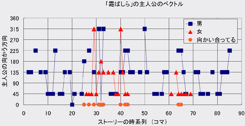 このようにコマの中に登場する主人公達の向きを数値化することにして、話の冒頭から結末までの各コマ中での主人公(周平)とその恋人(アキちゃん)の向きを調べてみたのが下のグラフである。青色の四角が主人公で、赤色の三角がヒロインである。また、その二人が向かい合ってる場合には朱色の丸を方向=0の位置に書き入れてみた。グラフ中では水平軸がストーリーの時系列で、左端が話の冒頭であり、右端が話の結末、そして縦軸が「主人公達の向かう方向」である。また、ヒロインのアキちゃんが途中の2カ所にしか現れないのは少しばかり悲しいストーリーのせいだ。この「霜ばしら」は主人公とアキちゃんの涙を誘う悲しい物語なのである。