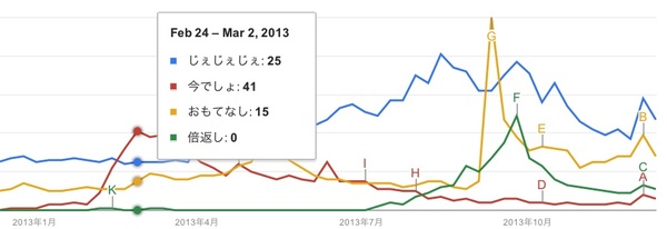 …というわけで、「今年の流行語大賞」をGoogleトレンドが客観的に眺めてみると、「お・も・て・な・し。」は瞬間風速はトップ・オブ・トップだけど積分値では中くらいで、「今でしょ!」と「倍返しだ!」は人気のピークは同じくらいなのだけれど一位というほどではなくて…という具合です。