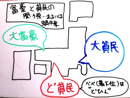 どんなものでも「図に描いてみる」ことが趣味なので、今日はそんな「富豪と貧民の関ヶ原」「大富豪と大貧民の蝸牛考」を描いてみました。それが下の日本地図です。