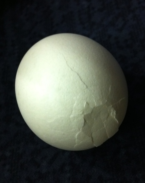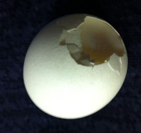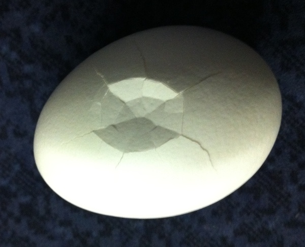 「殻が細かくひび割れてしまうのがマズイ」となると、こんなやり方が最高に思えます。それは、「平らなものに対して、曲率が低いゆで卵の胴の部分を打ち付ける」というやり方です。すなわち、(強度が低く・曲率も低い)ゆで卵の「腹」の部分を、平らなものにぶつけて幅広~く(粉々にならないように)割ってやろう、というやり方です。実際にこのやり方で「ゆで卵」を割ってみると、広い領域を・大きく(粉々でなく)殻を割ることができるますから、簡単にゆで卵を剥くことができます(右写真)。