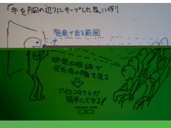 そんな携帯用ホワイトボードに描いた、ラクガキの例が下の画像です(あるいは、さらにその下に小さく張り付けたような「まとめ」用イラスト例になります)。本書のページを本屋で手にとって、一枚一枚めくってみれば、こんな稚拙なラクガキを元に綺麗に・わかりやすく描き直されたイラストを、必ずどこかに見つけることができるはずです。