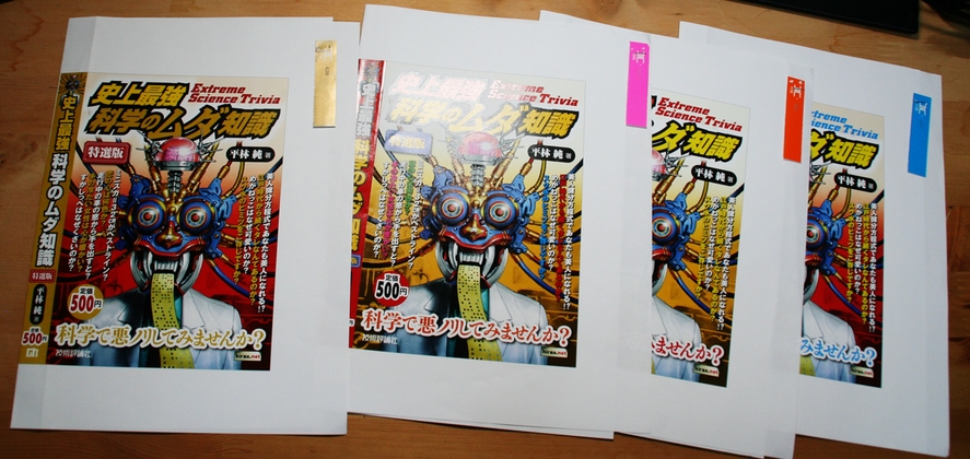 先週末に「コンビニに並べる廉価本」の原稿校正をしていました。右の写真は、そのコンビニ本の「表紙候補」たちです(この中には採用版は入っていません)。特色を1色だけ使うために、それぞれ右上に貼り付けてあるDIC(大日本インキ化学工業)の色見本を参考に、どの色を使うかどうかを決めるわけですね。