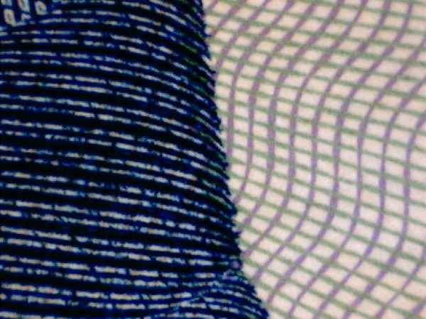 日本銀行の千円札の説明を読むと、千円札の偽造防止技術の一つに「深凹版印刷」があって、「従来のお札よりもインキが表面に盛り上がるように印刷されている」という。そこで眺めてみた。すると、確かに濃緑色のインクが(他の色のインクに比べ)高々と盛り上がって印刷されている。その分、ちょっとインクが乱れて汚い感じにも見える。