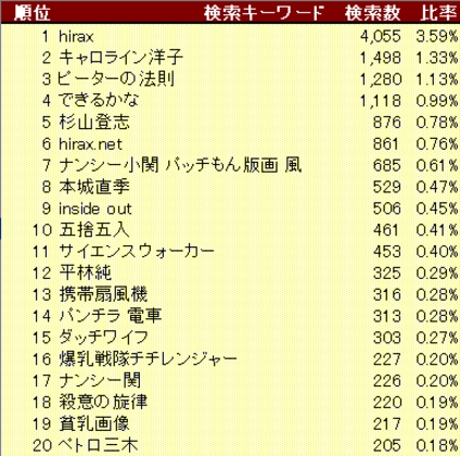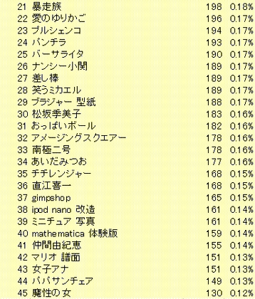 2006年上半期に、検索エンジン経由で"inside out"へ来た人の「検索キーワード」のトップ1-20と20-45を下に貼り付けてみました。驚くべきは、2位が"キャロライン洋子"だということです。inside out に来る人のうち、比率にして1.3%、人数にして1500人以上、が"キャロライン洋子"を探しているのです!?