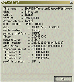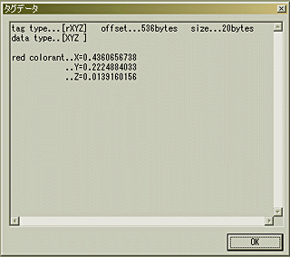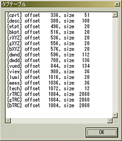 上の画面のように、試しにICMファイルを読み込んでみる。すると、その中身は次のようなものが書き込まれているのがわかる。これは、sRGBColor Space Profile.icmというファイルの中身の場合である。