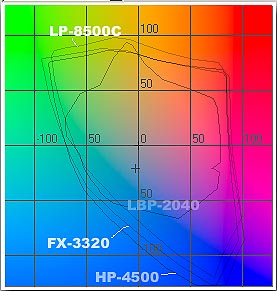この場合には、若干の違いはあるが大体同じであることがわかる。中身が同じで、ソフト部分のみ違うだけだと思うのであるから、当然とも言えるし、少し意外だとも言える。なぜ意外かというと、この二機種は実際に使ってみると結構出力が違うからである。もちろん、出力可能な領域だけでなくて、その内部でどう出力する色を振り分けるかということの方が実は一番重要だったりするので、「意外」というのは言い過ぎかもしれない。