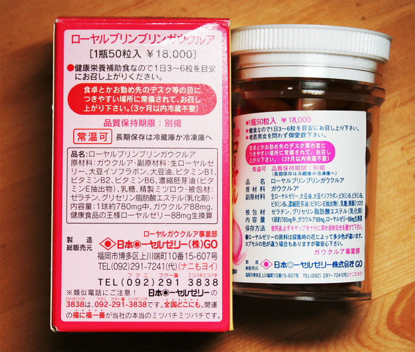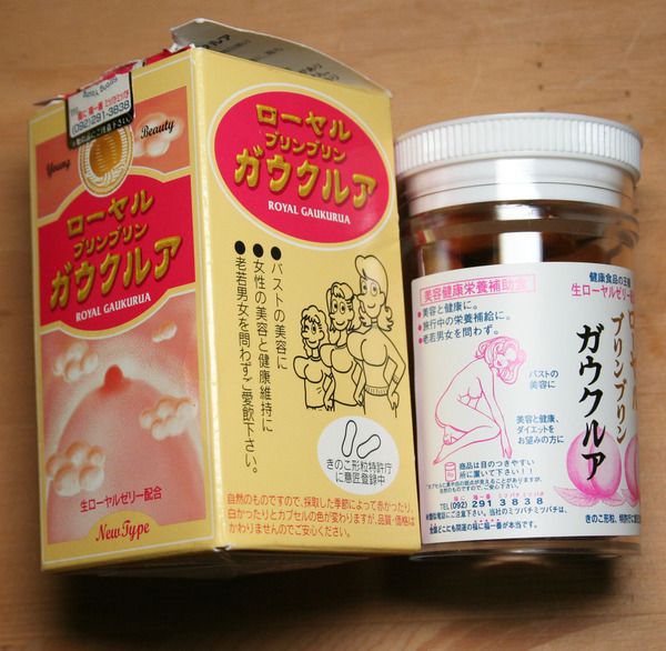 ローヤル ブリンブリン ガウクリアの粒は「風水専門家設計によるきのこ形」で、品質だけでなく、学業・事業などすべて良くなるイメージを持つ、という。瓶1本のお値段が「(少なくとも印刷されている価格では)一万八千円なり」なので、材料・加工法の売り向上だけでなく、そんな超科学的エッセンスも詰め合わされているのが楽しい。