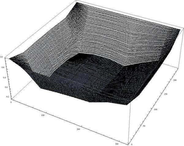 というわけで、記事に貼り付けられていた「ガウシアンフィルタ(ぼかし)」画像のRed・Greenチャンネルの数値を、3次元グラフにしてみました。それが下の2枚のグラフです。