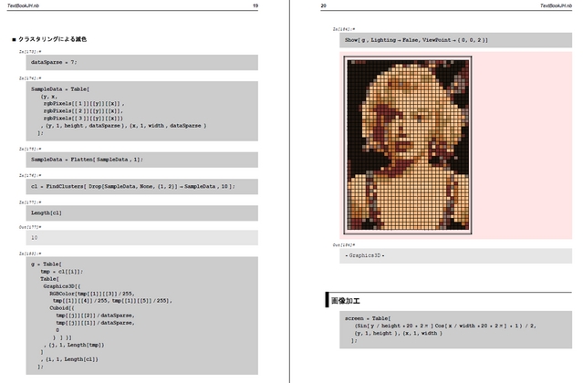 今週、「Mathematica 初級・入門コース」で90分程度の実演講師をするので、実演用テキストを作ってみました。Mathematicaを使ったことがない人を対象にしている…ということで、難しい機能を使わずに、画像入出力と三次元レンダリング動画とクラスタリングによる減色…といったような内容を扱っています。作った資料は、画像も入ったPDF版(3.2MB)・画像を削ったMathematicaのノートブック(26kB) といった感じになります。