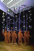 そういえば、NTTのインターコミュニケーションセンター(ICC)にはパラパラマンガの立体版のようなジャグラーなんていうものもある。これは、高速に点滅するストロボの光の中で、受話器やサイコロといったものに色々と姿を変えるものをお手玉のように放り投げ続ける人の姿が暗闇の中に浮かび上がる「立体パラパラマンガ」とでもいうべきもので、こちらの方もとても人気があるようだ。