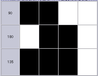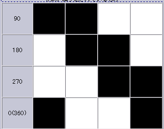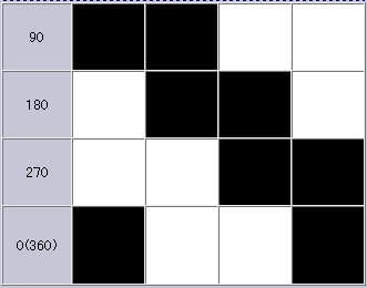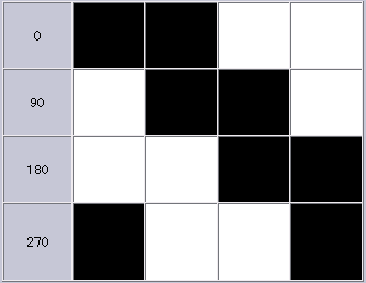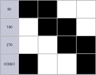「モアレのデバイス依存について考える。」で行ったようにこのようなパターンをOHPで打ち出し、重ね合わせてみる。例えば、位相0と位相180のものを重ね合わせたらどうなるだろうか。4x1ドットのマトリックスの全てが黒になる。すなわち、真っ黒になるのがわかるだろう。それでは、位相0と位相90のものではどうだろうか。4x1ドットのマトリックスの内、3ドットが黒、1ドットが白である。位相が同じものどうしを重ね合わせると、元と同じく、2ドットが黒、2ドットが白である。