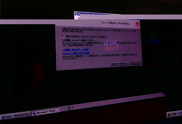 羽田空港の一角で、壁に埋め込まれた巨大ディスプレイに「問題が生じたためPower Pointが終了しました」というダイアログが出ていました。