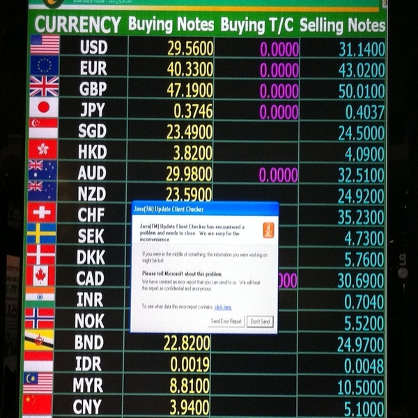 たとえば、「両替レート」を映し出しているかに見えて実はエラーダイアログを表示したままの巨大ディスプレイ、そしてその近くではJavaアップデート関連のエラーダイアログを映し出している空港内の両替コーナーディスプレイ、HTTPエラー500番を表示したままのキャッシュディスペンサー、Windowsメッセンジャー関連のエラーを吐いたままウンともスンとも言わずに眠っている空港情報システム…。