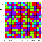 256人という比較的多い人数を考えた場合ですら、人生のドラマが続く中でそれぞれの血液型比率は結構変化して、それぞれの血液型の比率が逆転したりすることもあるわけだが、じゃぁもっと狭い領域に注目したらどうなるだろうか?例えば、下の瞬間の血液型分布・配置を眺めてみよう。