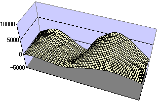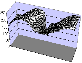 とはいえ、この「胸の谷間(点線で囲った矩形領域)」を単純にCSVfで立体グラフに直しても、下のグラフのようなわけの判らないグラフになってしまう。それはもちろん当たり前である。単純に「画像の明るさ」=「バストの高さ」になるわけがないのである。ほんの少しだけ、実写真の「胸の谷間」の高さ分布と似たような形状になってはいるが、これでは全くの別物であることは間違いない。よほどの想像力豊かな人であれば別だと思うが、少なくともワタシはこのグラフからでは「胸の谷間」を想像することはできないのである。