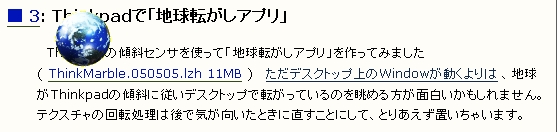 Thinkpadの傾斜センサを使って「地球転がしアプリ」を作ってみました(ThinkMarble.050505.lzh 11MB) ただデスクトップ上のWindowが動くよりは、地球がThinkpadの傾斜に従いデスクトップで転がっているのを眺める方が面白いかもしれません。付属のテクスチャ(レンダリング画像)ファイルを入れ替えれば、もちろんお好きな物体をデスクトップの上で転がすことができます。テクスチャの回転処理は後で気が向いたときに直すことにして(テクスチャ用のファイルの保持の仕方も変えたいようにも思いますし…)、とりあえず置いちゃいます。Thinkpad T41, X41以降のユーザーの方は地球をデスクトップで転がしてみたり、画面の端にぶつけて「コツン」と音を出したりしてみて下さいな。傾ければ傾けるほど、「いつもより余計に回しております〜」状態になります。動かしてみた画像はこちらにあります。