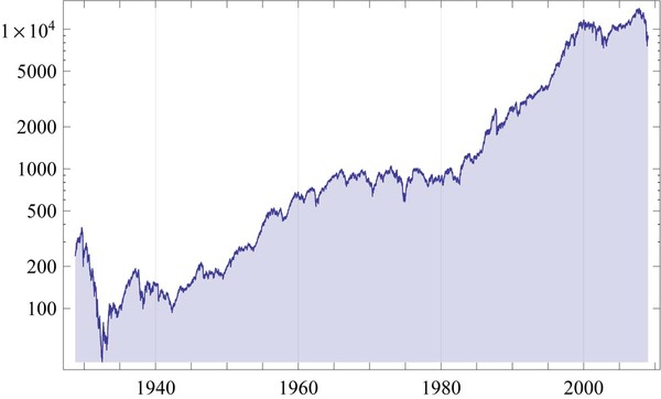 右のグラフは、1930年頃から現在までのダウ平均株価(工業株30種平均株価)です。工業株と名付けられてはいますが、30種の採用銘柄を見ればわかるように、平均株価を算出する30の会社は、社会の動きを反映するような広い業種から選ばれています。