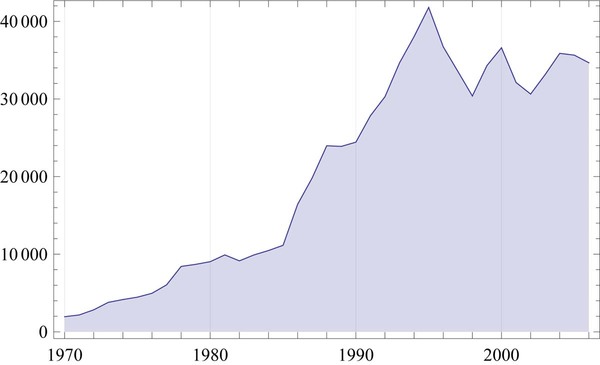 さて、次に眺める右のグラフは、(人口で正規化した)日本の国内総生産(GDP)です。1970年から現在までのデータですが、大雑把にはダウ平均株価と同じ動きになっています。また、1990年半ばから現在までは、上下動はあるものの、停滞し続けているように見えてきます。