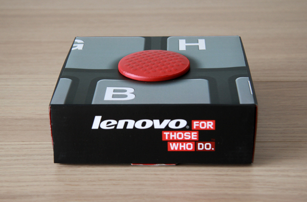"この巨大トラックポイントは非売品のため他では入手できません。なお、大きいトラックポイントはストレス解消グッズとしてご利用いただき、同梱されている通常のトラックポイントキャップ3種類(各2個ずつ計6個)をお持ちの ThinkPad にてご利用ください。"