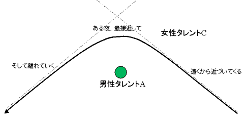 しかも、男性タレントAの存在感と女性タレントCの存在感はあまりに差がある。そのため、女性タレントCが近づいてきても男性タレントAはビクともしない。もちろん、もともと男性タレントA自身は芸能界の中をどっしりと動いているわけであるが、女性タレントCが近づいてきても我関せずである。それに対して、女性タレントCは男性タレントAに近づくことで影響を受ける。