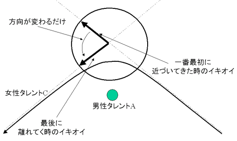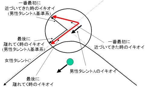 すると、一般視聴者を基準とした座標系では、面白いことに女性タレントのイキオイ自体も男性タレントに接近する前と後で変わるのである。もちろん、上の図を見てもらうと判るように、男性タレントA基準系では女性タレントのイキオイは方向が違うだけで、大きさはなんら変わっていない。しかし、それは男性タレントA自身がイキオイがあるためで、一般視聴者を基準とした座標系では女性タレントCのイキオイは増しているのである。赤い線で描いた「一般視聴者を基準とした座標系での女性タレントCのイキオイ」が最初と最後で違っているのが判るだろう。つまり、女性タレントCはこの接近戦でイキオイが増しているわけだ。これが比較的高度な「SEXYタレントの売り出し術」である。このテクニックを使えば、男性タレントの背後から近づけば女性タレントCのイキオイは必ず増すということになる。