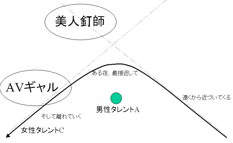 そして男性タレントB相手の場合には、もうひとつ問題がある。相手が名実共にA級のタレントAであると、タレントAは女性タレントCが近づいたくらいではビクともしない。しかし、それがタレントBの場合だと、あまりに重みがないために女性タレントCがタレントBに近づくと揺れ動いてしまうのである。そんな状態では「SEXYタレントの方向転換」すら上手く行くかどうか判ったものではない。誠意大将軍の彼を頭に浮かべて頂ければ、おそらく納得して頂けると思う。