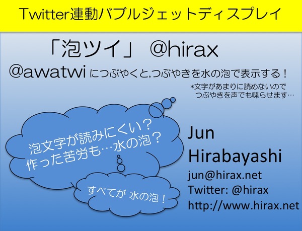 このTwitter連動 ”バブルジェットディスプレイ”には不具合がたくさんあって、たとえば、「つぶやき」内容をよく知ってないと泡が描く文字を読めとることができない(それどころか、内容を知ってても読めないことだって多い!)なんていう大欠陥すらあります。