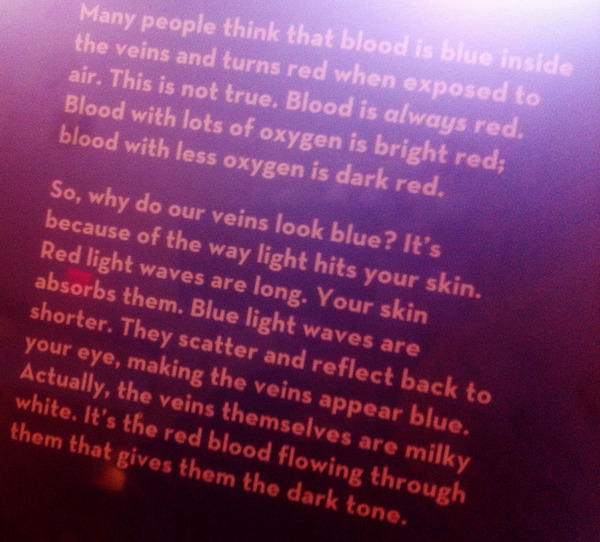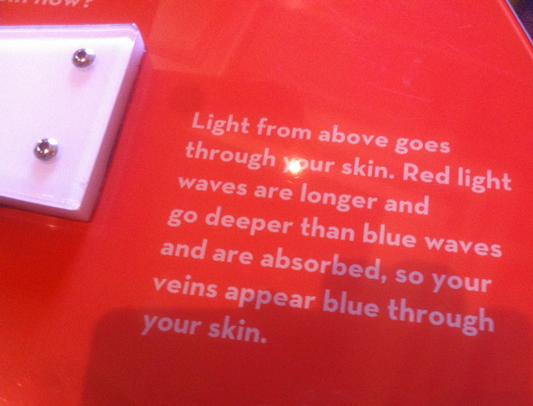フランクリン科学博物館にある「腕の静脈が青く見える理由の説明展示」フランクリン科学博物館にある「腕の静脈が青く見える理由の説明展示」フランクリン科学博物館にある「腕の静脈が青く見える理由の説明展示」