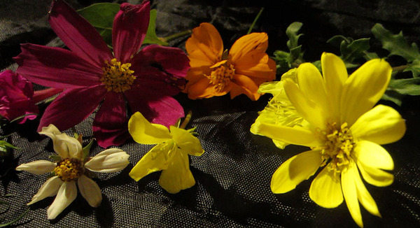 紫外線カメラで眺めるなら、せっかくなので「昆虫が普段眺めていそうなもの」として、川沿いに咲いていた花を摘んで撮影してみたのが下の写真です。左の写真がが可視光のカラー画像、右が紫外線撮影したものです。紫外線で眺めてみると、同じような色に見えても、花びらと花の中心部の明るさが全く異なっていたりして面白くなります。またあるいは、可視光では暗く沈んだ赤色に見えていた花が紫外線の世界では明るく輝いていたり、生き生きとした明るい橙色の花が紫外線では全く見えない暗黒のような花だったり…と意外で面白く感じます。