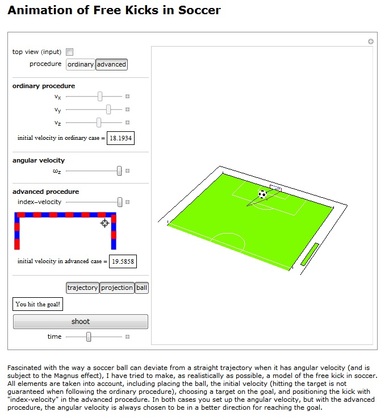 無料のMathematica Playerをダウンロードすれば、サッカーのフリーキックをして遊び、そして、その科学を知ることができる"Animation of Free Kicks in Soccer". ボールを思うがままに蹴る技術も、ボールを力いっぱい蹴る場所もない人でも、少し楽しめるかもしれません。