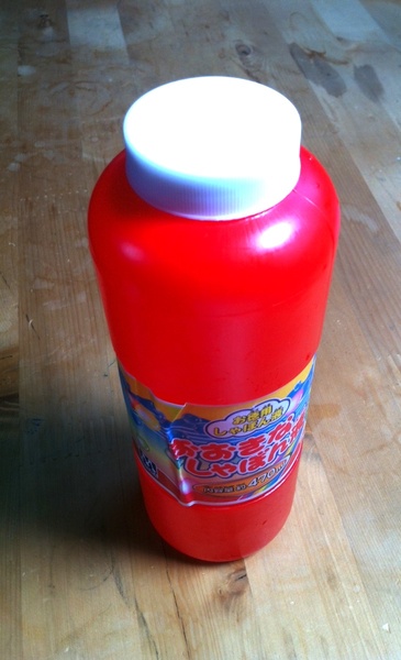 後日談:数日後、980円ナリで「しゃぼんパレード」を買ったディスカウントストアに行ってみると、補充用シャボン液もちゃんと売っていました。470mlで298円ナリ、1.8リットル(一升瓶だ!)で798円ナリ…というわけで、「水と洗剤を比率を変えつつ混ぜ合わせる工夫ができる・その過程を楽しめる」ことができなくとも、「充電池を使う」ことさえできれば、「絶対お勧め」の一品です。(ちなみに、右の写真は試しに買ってみた470mlのシャボン液です)